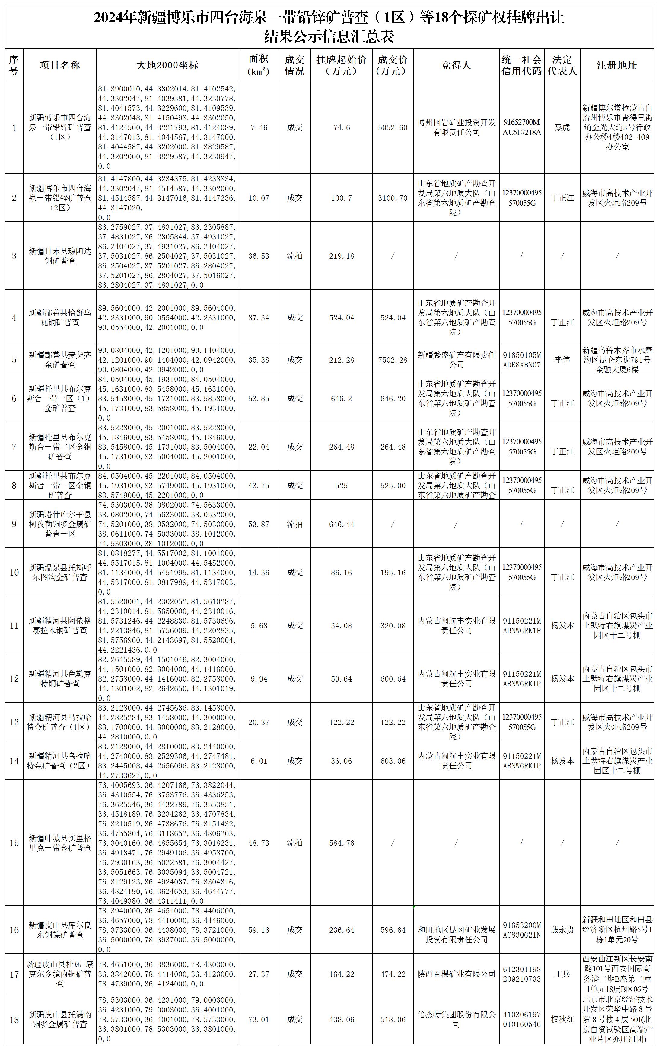 附表:2024年新疆博樂市四臺海泉一帶鉛鋅礦普查(1區(qū))等18個探礦權(quán)掛牌出讓結(jié)果公示信息匯總表