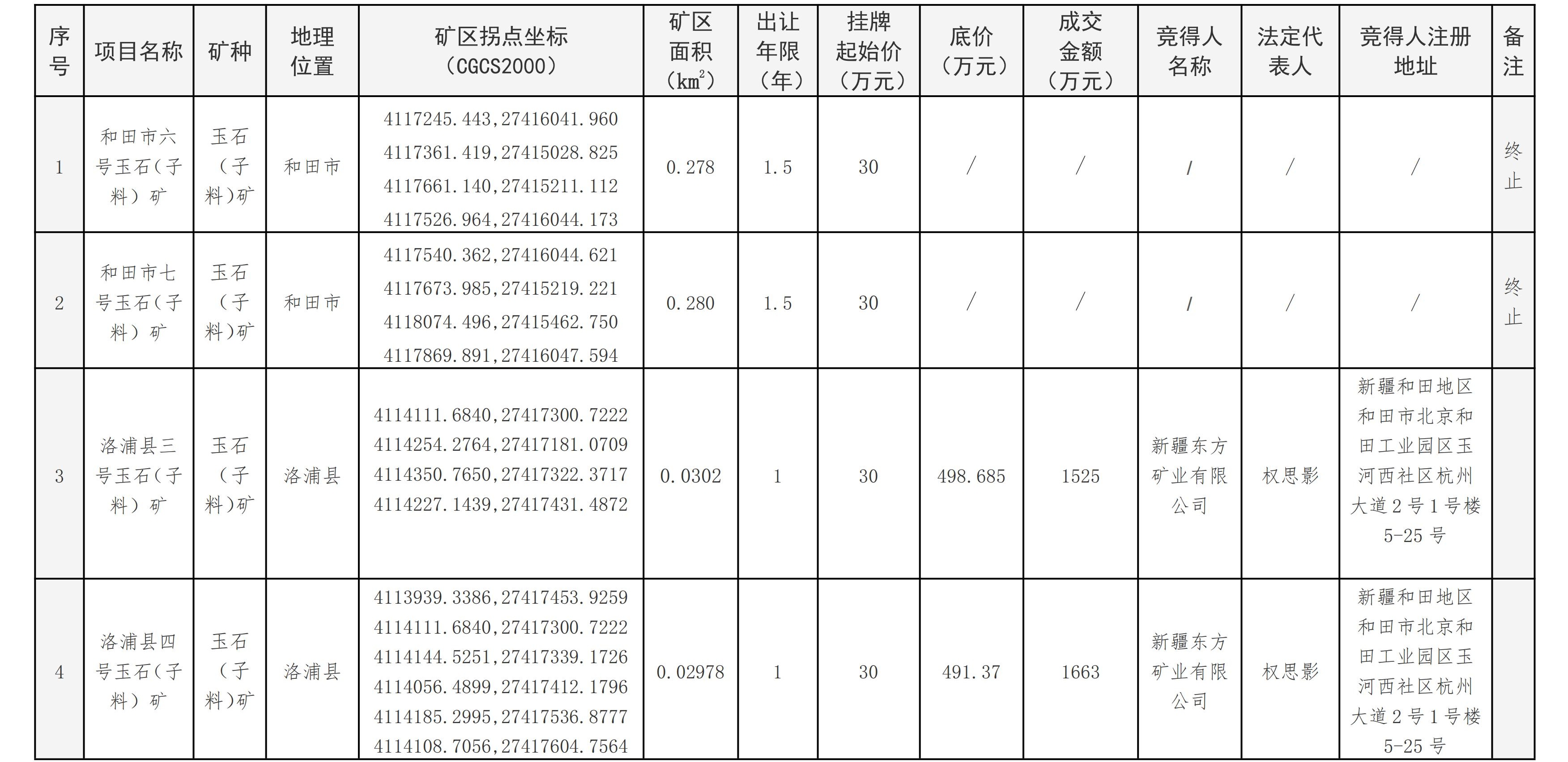 根據(jù)《礦業(yè)權(quán)出讓交易規(guī)則》等有關(guān)規(guī)定,按照《和田地區(qū)采礦權(quán)出讓公告》(和礦采告字〔2024〕7號)程序,現(xiàn)將網(wǎng)上掛牌方式出讓成交結(jié)果公示如下: