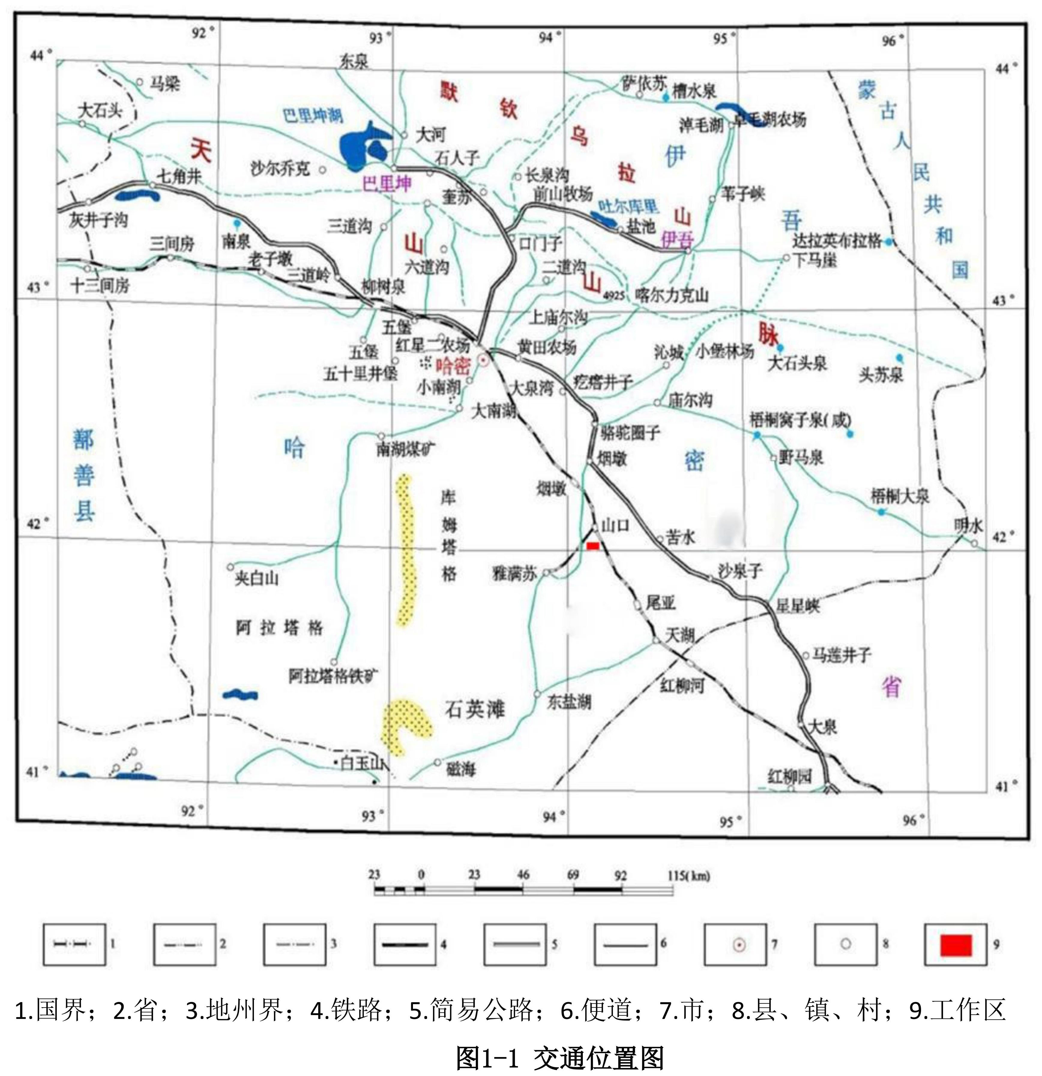 5.交通位置:礦業(yè)權(quán)隸屬新疆哈密市管轄,位于新疆哈密市150°方位約110千米處,地處東天山中東部東天山中東部,屬低山-丘陵地形,戈壁沙漠地貌景觀,其間沒有高大的山地,海拔高度935-960米,大部分地區(qū)相對高差不足30米。