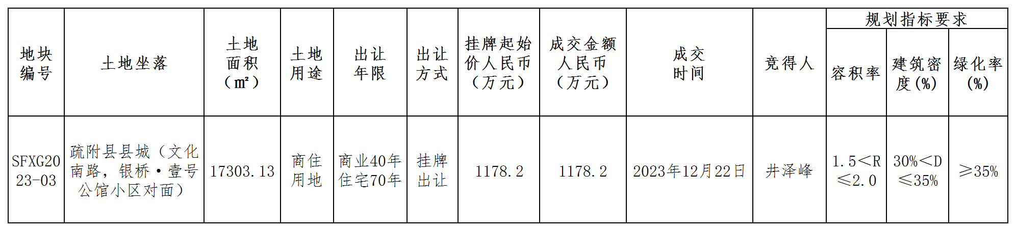 疏附縣自然資源局國有建設(shè)用地使用權(quán)成交結(jié)果公示(SFXCRCJ2023-8)