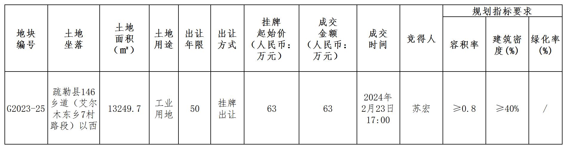 疏勒縣自然資源局國有建設(shè)用地使用權(quán)拍賣出讓成交結(jié)果公示(勒自然成字[2024]06號)