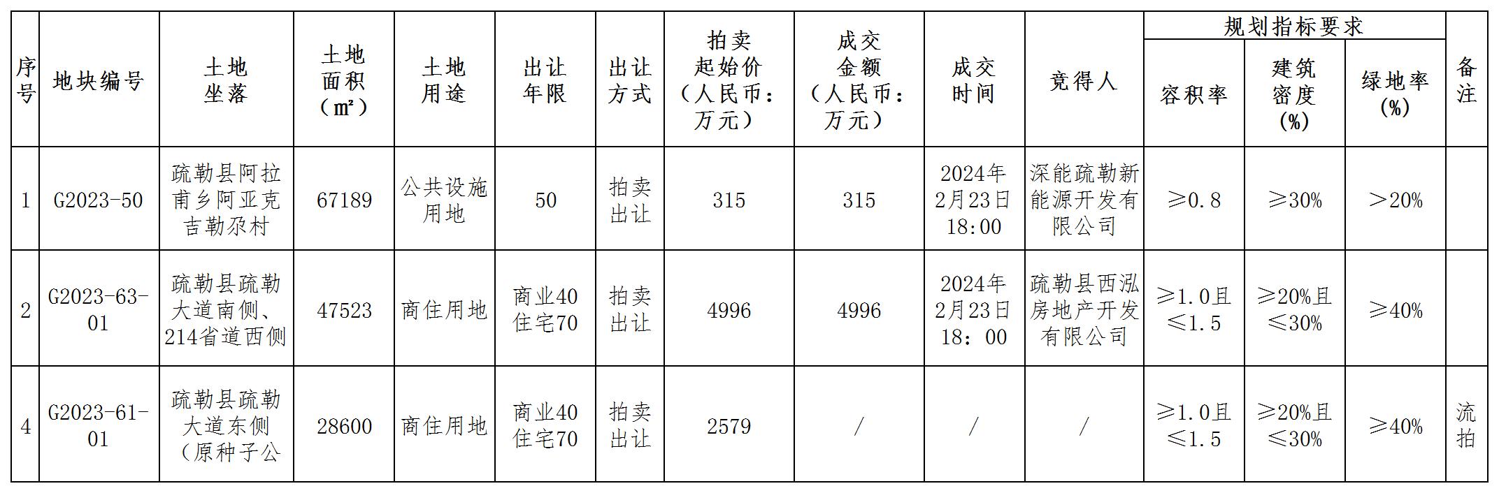 疏勒縣自然資源局國(guó)有建設(shè)用地使用權(quán)拍賣(mài)出讓成交結(jié)果公示(勒自然成字[2024]04號(hào))
