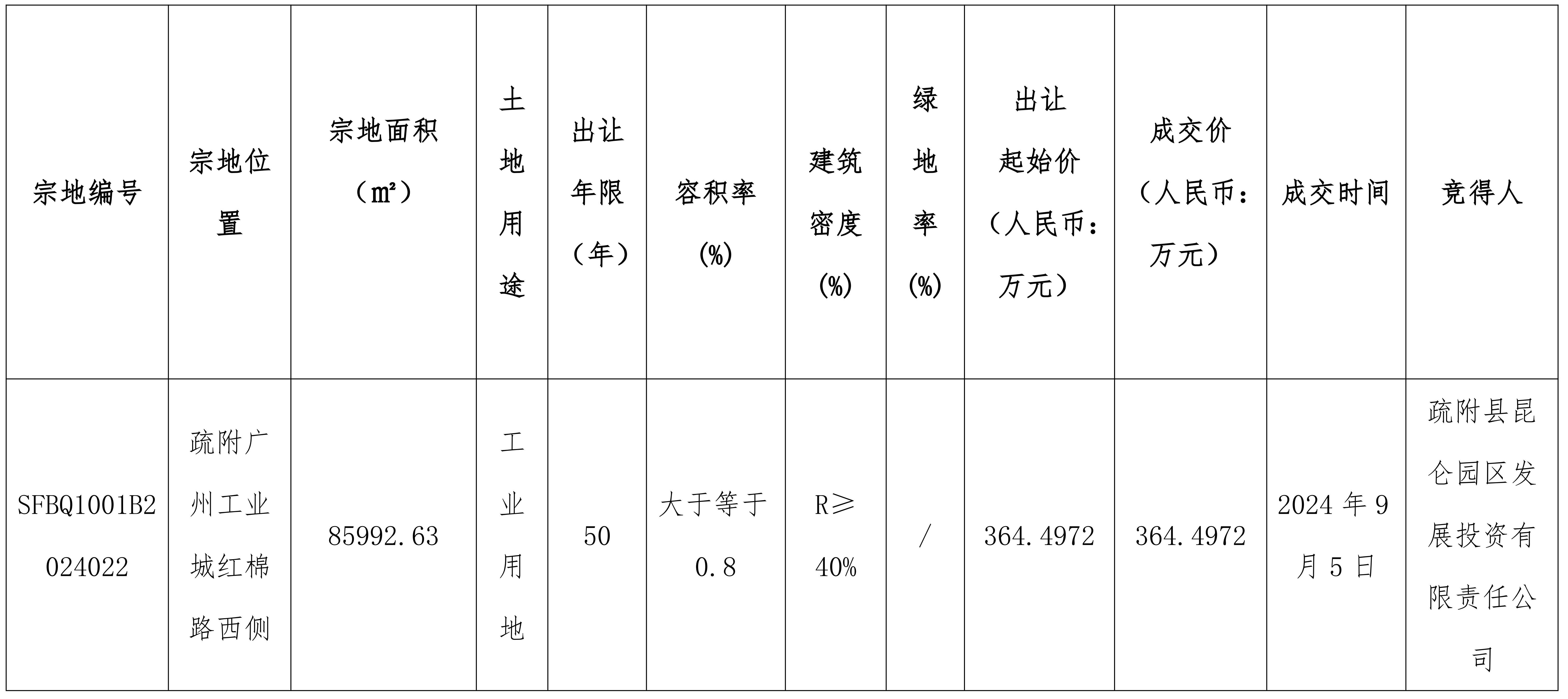 根據(jù)《中華人民共和國土地管理法》《招標(biāo)拍賣掛牌出讓國有建設(shè)用地使用權(quán)規(guī)定》(國土資源部令第39號(hào))《自治區(qū)深化公共資源交易平臺(tái)整合共享工作方案〉的通知》(新政辦函〔2019〕250號(hào))等有關(guān)法律法規(guī)及文件的規(guī)定,疏附縣自然資源局以掛牌方式出讓1(幅)地塊的國有建設(shè)用地使用權(quán),現(xiàn)將出讓成交結(jié)果公示如下: