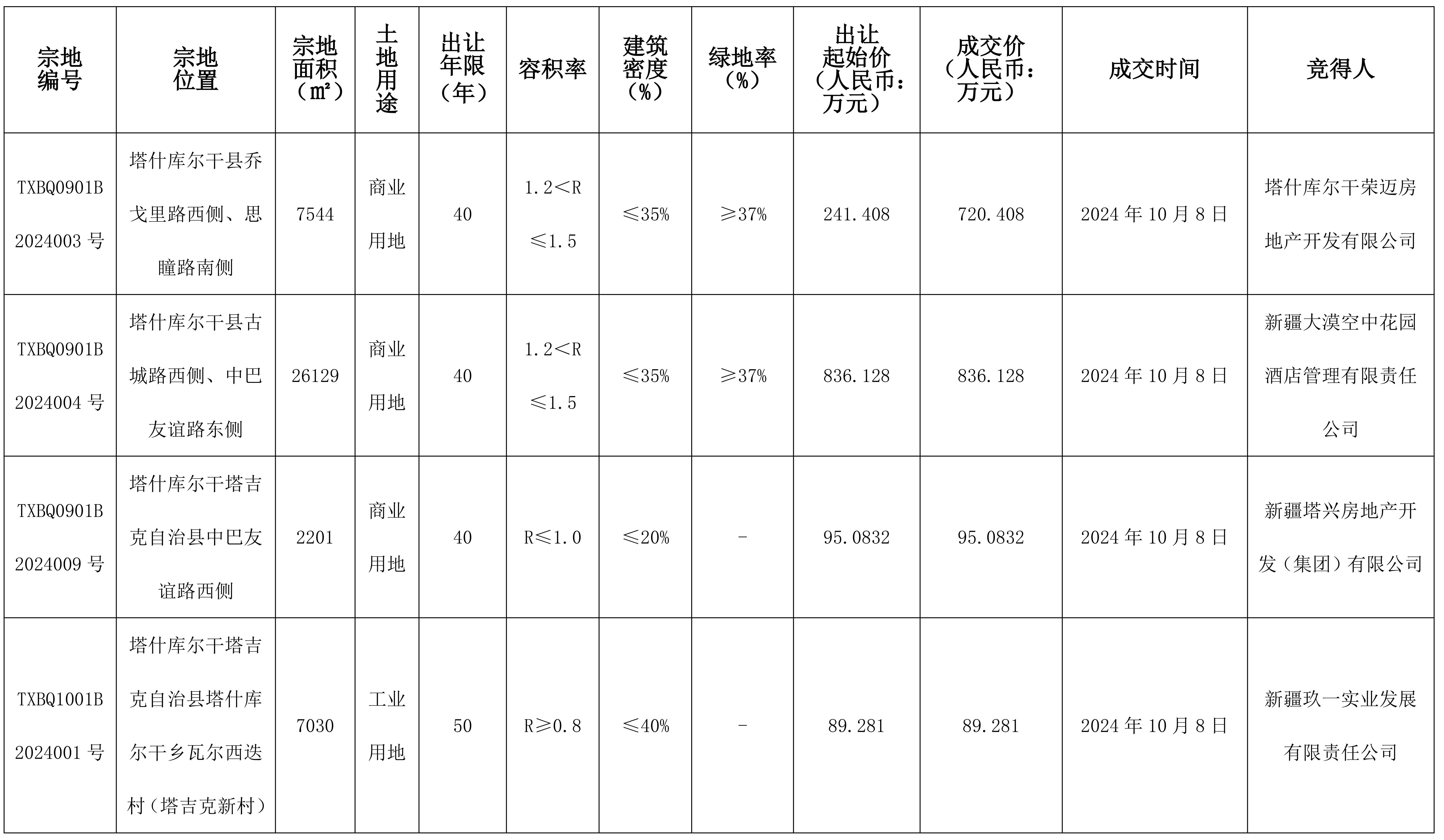 根據(jù)《中華人民共和國土地管理法》《招標拍賣掛牌出讓國有建設用地使用權規(guī)定》(國土資源部令第39號)《自治區(qū)深化公共資源交易平臺整合共享工作方案〉的通知》(新政辦函〔2019〕250號)等有關法律法規(guī)及文件的規(guī)定,塔什庫爾干塔吉克自治縣自然資源局以拍賣方式出讓4(幅)地塊的國有建設用地使用權,現(xiàn)將出讓成交結(jié)果公示如下:
