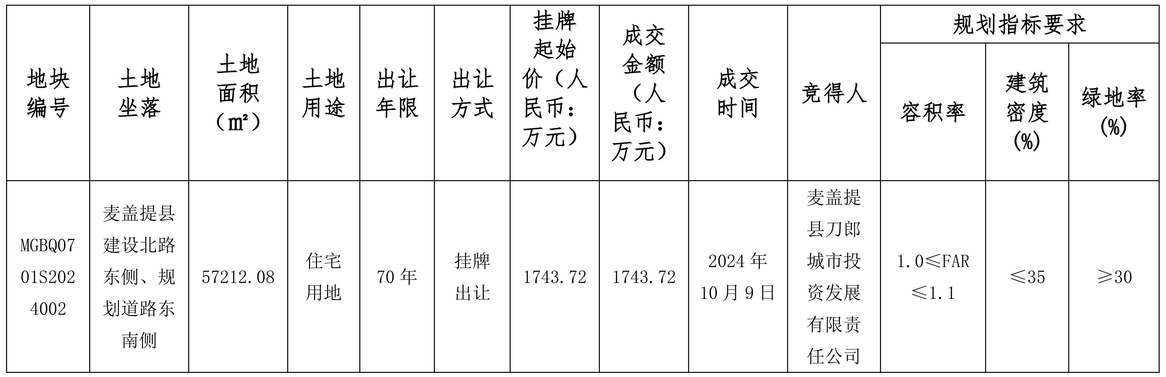 根據(jù)《中華人民共和國土地管理法》《招標拍賣掛牌出讓國有建設(shè)用地使用權(quán)規(guī)定》(國土資源部令第39號)《自治區(qū)深化公共資源交易平臺整合共享工作方案〉的通知》(新政辦函〔2019〕250號)等有關(guān)法律法規(guī)及文件的規(guī)定,麥蓋提縣自然資源局以掛牌方式出讓1(幅)地塊的國有建設(shè)用地使用權(quán),現(xiàn)將出讓成交結(jié)果公示如下: