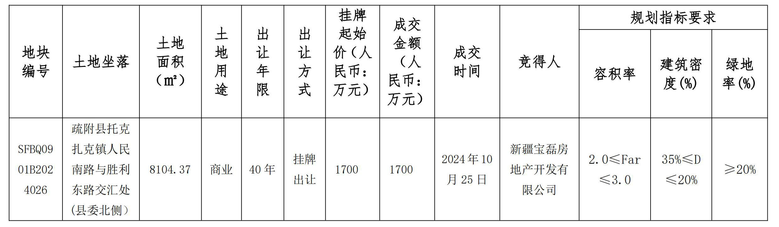 根據《中華人民共和國土地管理法》《招標拍賣掛牌出讓國有建設用地使用權規(guī)定》(國土資源部令第39號)《自治區(qū)深化公共資源交易平臺整合共享工作方案〉的通知》(新政辦函〔2019〕250號)等有關法律法規(guī)及文件的規(guī)定,疏附縣自然資源局以掛牌方式出讓1(幅)地塊的國有建設用地使用權,現將出讓成交結果公示如下: