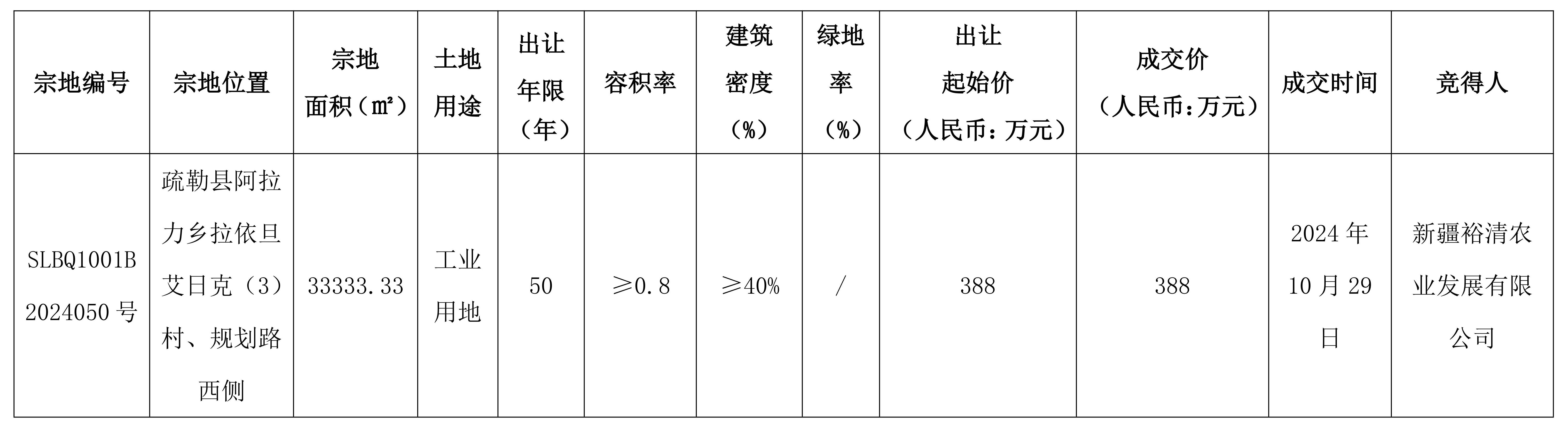 根據(jù)《中華人民共和國土地管理法》《招標(biāo)拍賣掛牌出讓國有建設(shè)用地使用權(quán)規(guī)定》(國土資源部令第39號(hào))《自治區(qū)深化公共資源交易平臺(tái)整合共享工作方案〉的通知》(新政辦函〔2019〕250號(hào))等有關(guān)法律法規(guī)及文件的規(guī)定,疏勒縣自然資源局以掛牌方式出讓1(幅)地塊的國有建設(shè)用地使用權(quán),現(xiàn)將出讓成交結(jié)果公示如下: