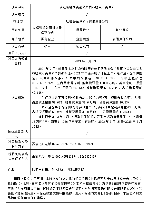 轉(zhuǎn)讓新疆托克遜縣艾西布拉克石英巖礦