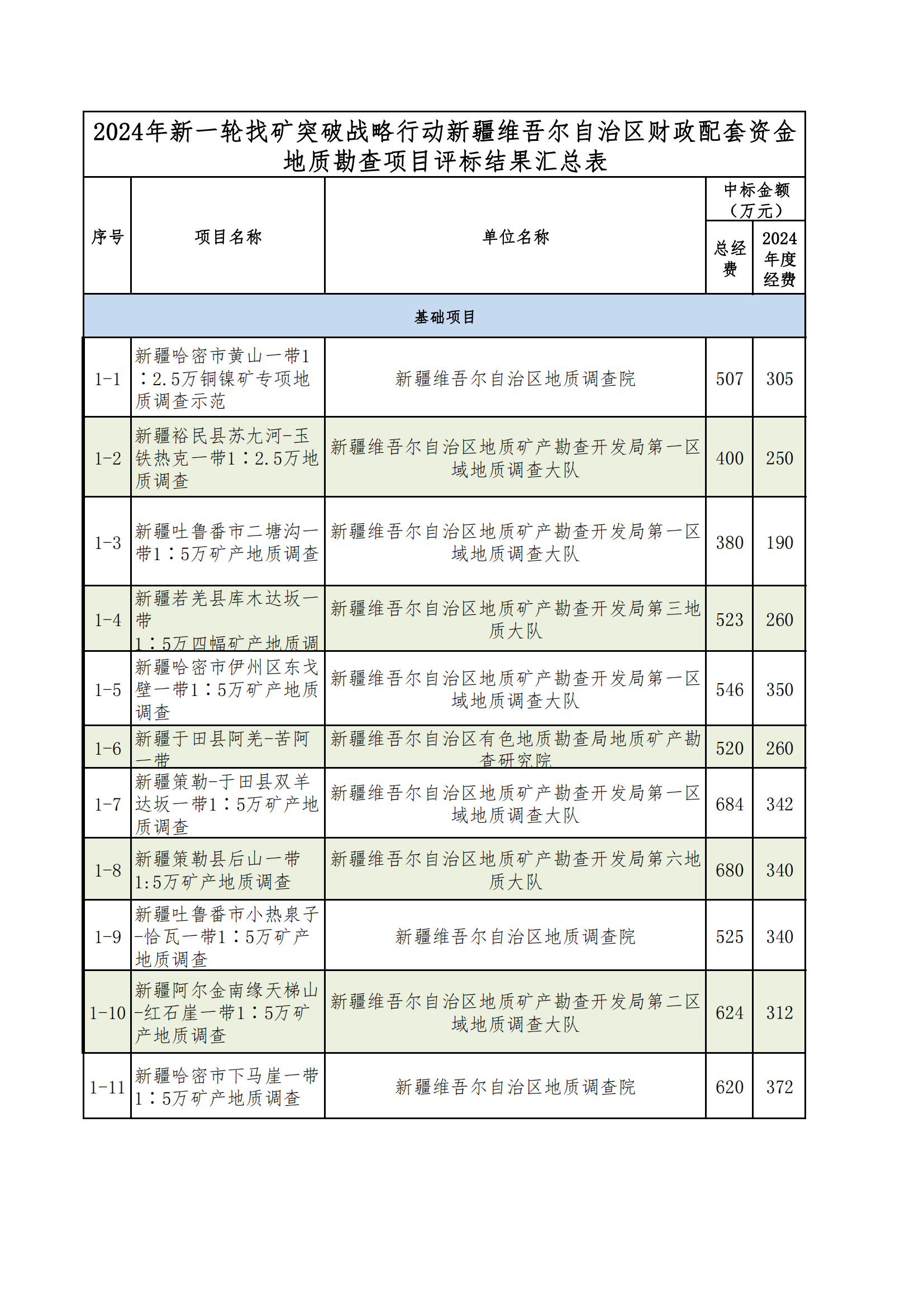 2、2024年新一輪找礦突破戰(zhàn)略行動(dòng)新疆維吾爾自治區(qū)財(cái)政配套資金地質(zhì)勘查項(xiàng)目評(píng)標(biāo)結(jié)果匯總表