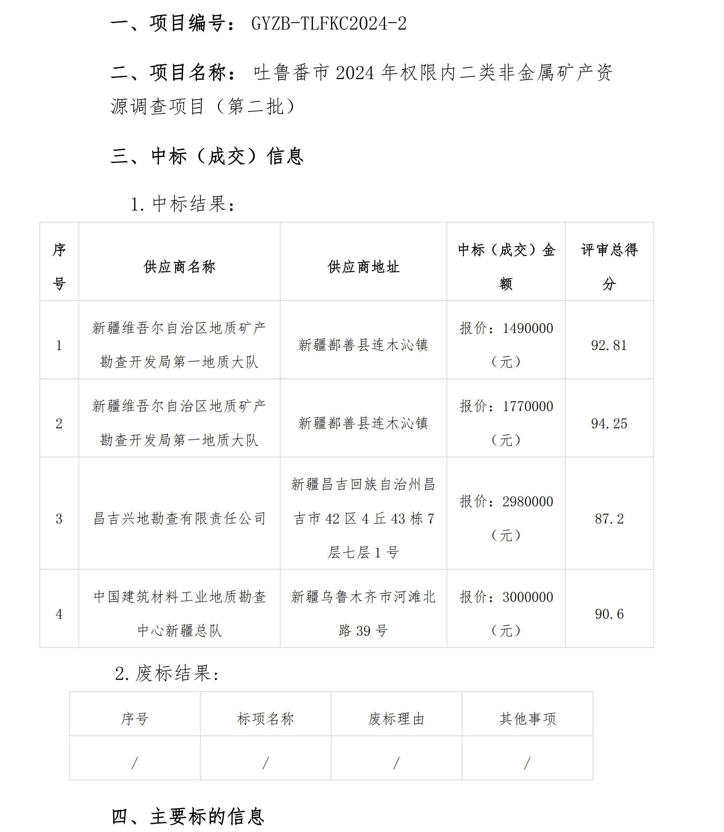 吐魯番市2024年權(quán)限內(nèi)二類非金屬礦產(chǎn)資源調(diào)查項目(第二批)中標(成交)結(jié)果公告